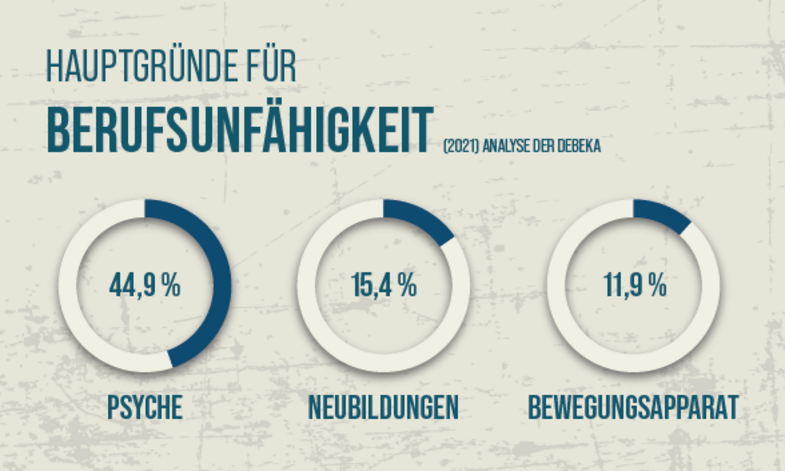 Der Anteil psychischer Erkrankungen als Hauptursache für Berufsunfähigkeit schwankt seit Jahren zwischen 40 und 45 Prozent. Nachdem er im Jahr 2020 mit 40,6 Prozent rückläufig war, übertraf er mit 44,9 Prozent 2021 sogar leicht das Niveau von 2019 (44,1 Prozent). Im Vergleich zum Vorjahr stieg der Anteil der Psyche als Grund, seinem Job nicht mehr nachkommen zu können, im Jahr 2021 um 4,3 Prozentpunkte.Andere Hauptursachen gesunken