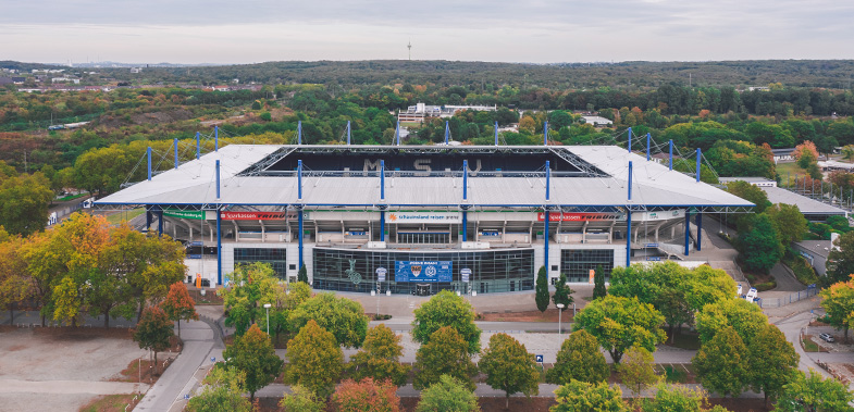 Abgebildet ist das Stadion des MSV Duisburg mit Eingangsbereich (Foto: uslatar / stock.adobe.com)
