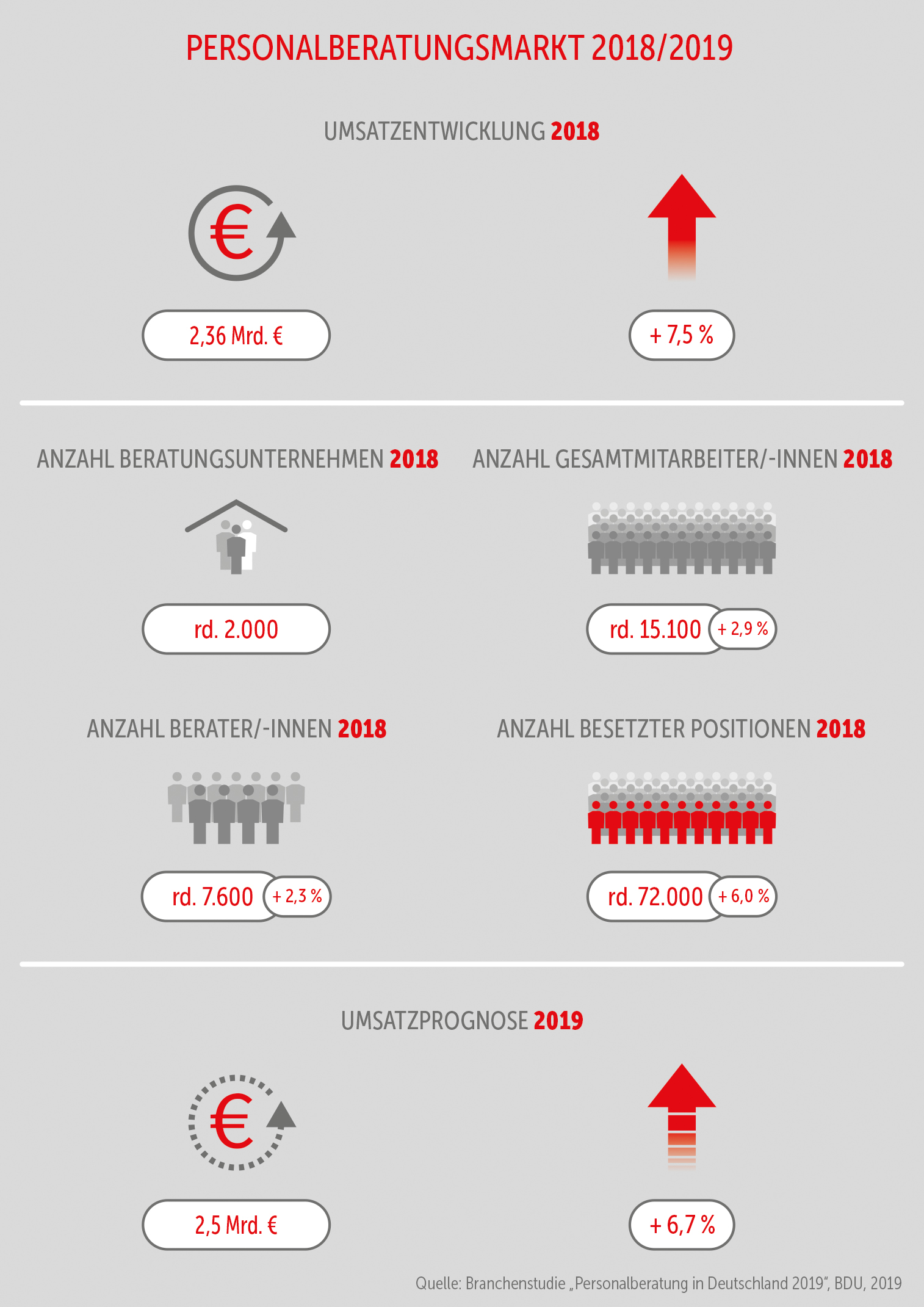 Der Umsatz der Branche ist im Jahr 2018 um 7,5 Prozent auf insgesamt 2,36 Milliarden Euro gestiegen. Auch für das laufende Jahr 2019 bleiben die Headhunter trotz Unsicherheiten – zum Beispiel durch die weltweiten Handelskonflikte und den noch ausstehenden Brexit – optimistisch. Auf Grundlage der Veröffentlichung ergibt sich für das laufende Geschäftsjahr eine Wachstumsprognose von plus 6,7 Prozent.