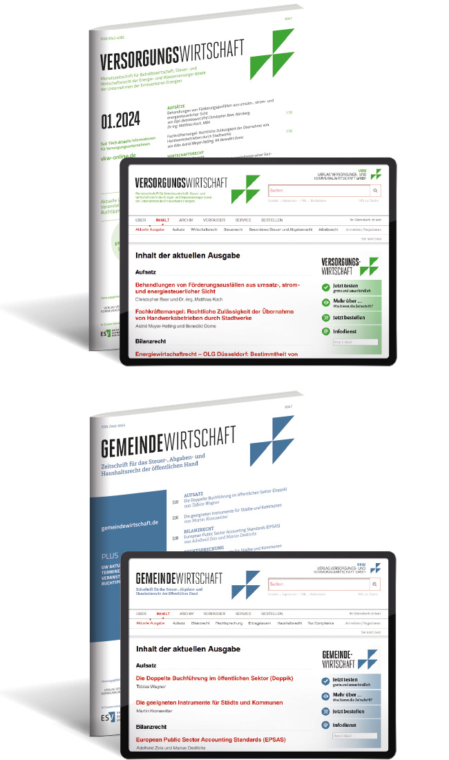 (Berlin, 14. Februar 2024) Mit der „Versorgungswirtschaft“ und der „Gemeindewirtschaft“ erscheinen nun zwei vom Münchner VKW Verlag Versorgungs- und Kommunalwirtschaft herausgegebene Fachzeitschriften in Kooperation mit dem Berliner Erich Schmidt Verlag.