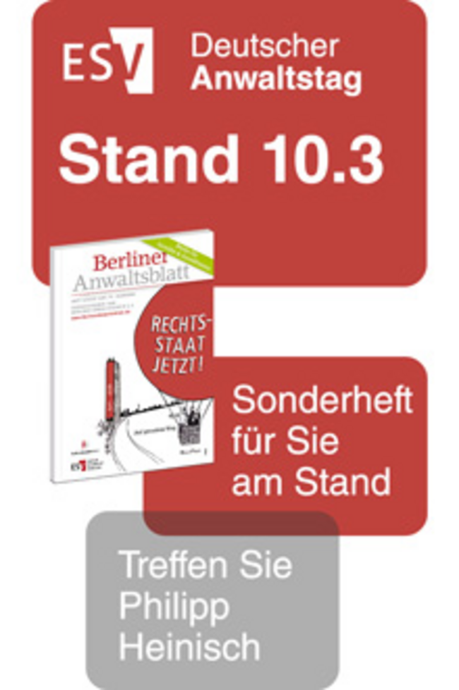 (Berlin, 3. Juni 2025) Vom 5.-6. Juni 2025 findet der Deutsche Anwaltstag im Berliner ECC Estrel Congress Center statt. Auch der Erich Schmidt Verlag engagiert sich bei der bundesweiten Tagung der Anwaltschaft.